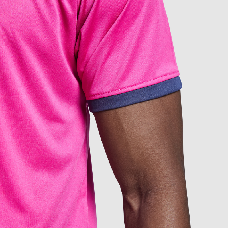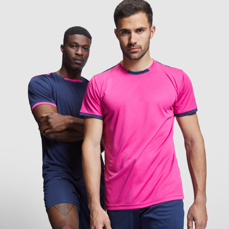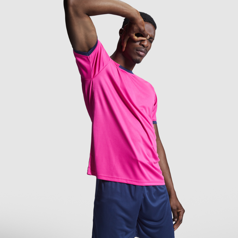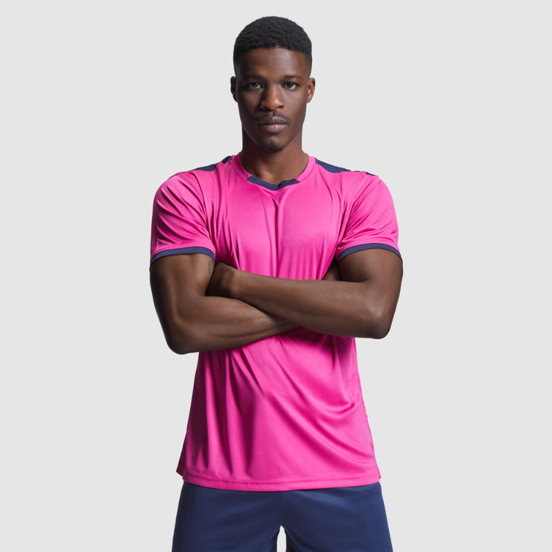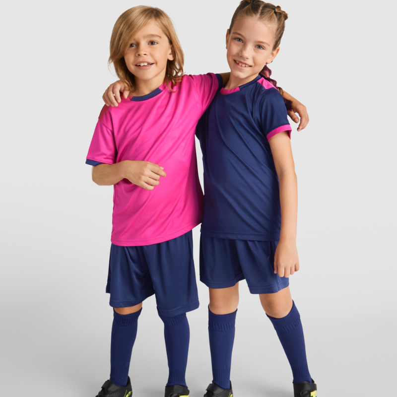 Draktsett med hjemme- og bortetrøye og shorts. 140 gsm 100% polyester, innsydde panler i kontrastfarge i krage, skuldre og ermer.