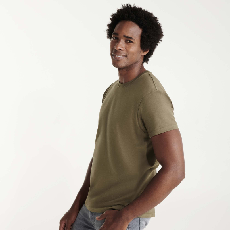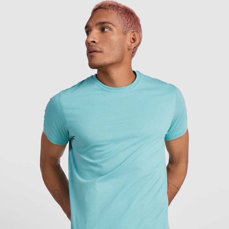 190 gsm 100% single jersey bomull. Oeko-Tex Standard 100. Rund hals med elastan